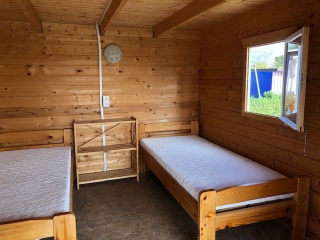 Zur einfach-zweckmäßigen Ausstattung gehören zwei Einzelbetten aus Kiefernholz mit Matratzen, Beleuchtung, Steckdosen, ein kleines Holzregal und eine Terrasse mit Sitzgelegenheiten.